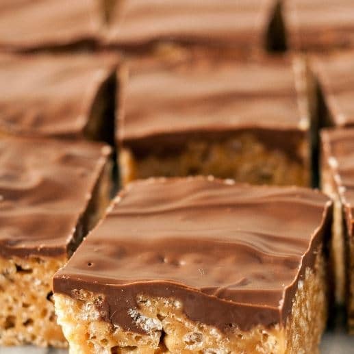 I haven’t posted a dessert recipe in a few days, so I thought it was time. I’m not sure this is a dessert anyway. It actually is more of a snack. I’m going to go as far as to say it is actually healthy. It has peanut butter–protein; crispy rice cereal–grain; butter–dairy; and chocolate–vegetables. Yes, that is correct. Chocolate comes from a seed so I’d classify it as a vegetable. Technically the peanut butter is also a vegetable (well really technically, peanut butter comes from legumes.)