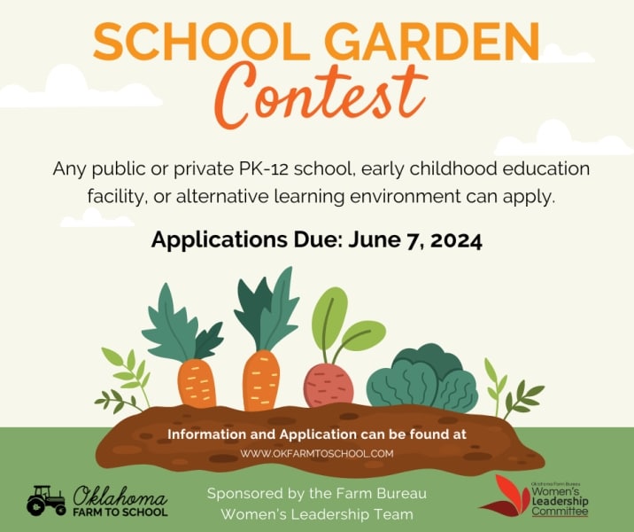 The Oklahoma Department of Agriculture and Farm Bureau Women’s leadership team are excited to offer the 2024 School Garden Contest for our state. Applicants may be any public and private: PK-12 school, early childhood education facility, and alternative learning environment.