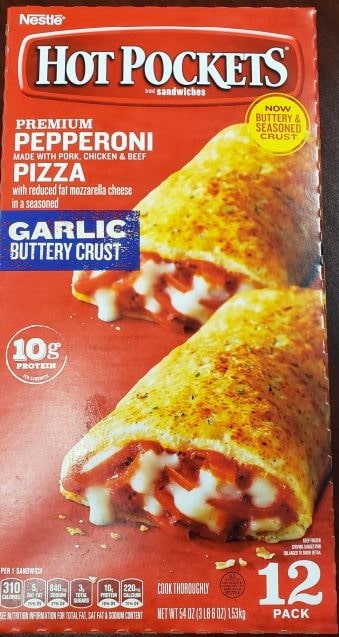 - 54-oz carton packages containing 12 “Nestlé HOT POCKETS BRAND SANDWICHES: PREMIUM PEPPERONI MADE WITH PORK, CHICKEN & BEEF PIZZA GARLIC BUTTERY CRUST” with a “BEST BEFORE FEB 2022” date and lot codes 0318544624, 0319544614, 0320544614, and 0321544614.
