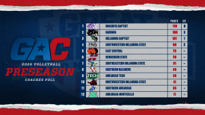East Central edged out Henderson State for fifth. The Reddies bring back a pair of All-GAC selections in Second-Team outside hitter Katilyn Steffes and defensive specialist Kaylon Partain. Steffes, GAC Newcomer of the Year ranks as the top GAC returner in points per set. She ranked fourth at 3.96 per set. Partain ranked second in total digs and digs per set.