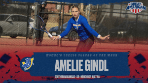 RUSSELLVILLE, Ark. – The Great American Conference announced the women’s tennis player of the week for the seventh week of the 2025 season. Southern Arkansas’ Amelie Gindl collected the award after helping the Muleriders collect two victories.