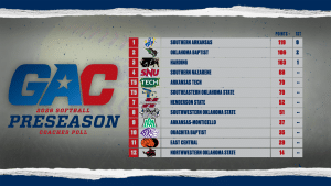 Arkansas Tech and Southeastern Oklahoma State tied for fifth. The Golden Suns’ Aly White won seven games with a 2.54 ERA and Caroline Wilhelm returns after collecting a team-high 36 RBI. The Savage Storm return three All-GAC performers in India McMurray, Trinity Oden and Iliana Olivares. McMurray’s 14 home runs ranked second in the conference. Oden struck out 115 batters against just 23 walks in 102.2 innings pitched. Olivares led the GAC with 20 doubles.