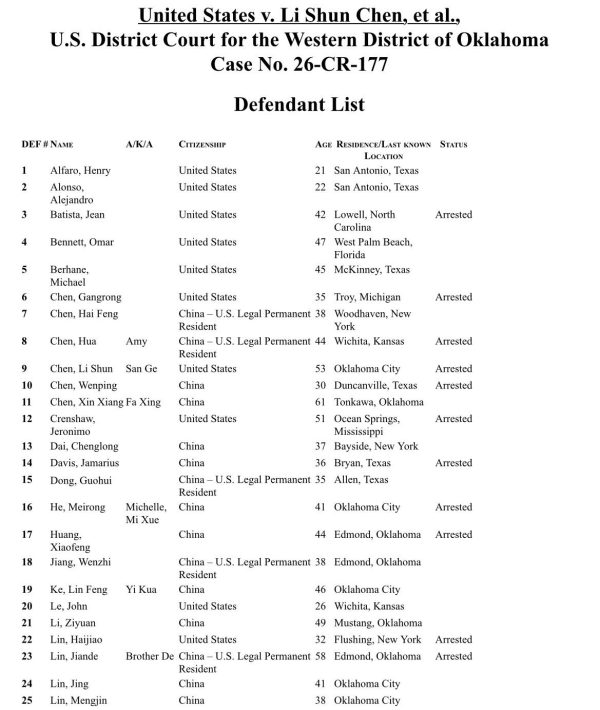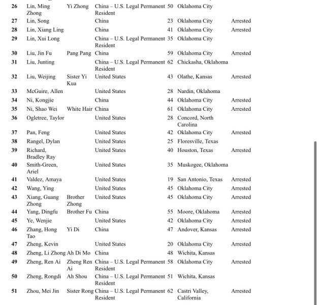 In a coordinated takedown late last week, more than 100 law enforcement personnel executed arrest warrants involving 51 defendants from Oklahoma, Texas, New York, North Carolina, Florida, Michigan, Kansas, Mississippi, and California. Of the indicted targets, 28 have been arrested and 23 remain fugitives. A full list of defendants is attached, including at least 29 from China, some of whom have permanent legal resident status.
