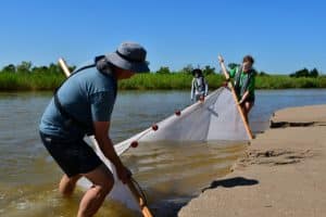A 4-by-15-foot mesh net, or seine, is hauled through the water to sample the river channel, along the banks, and a mix of other river habitats. Biologists examine every fish captured, and log the total number of seine hauls, habitats sampled, and fish caught.